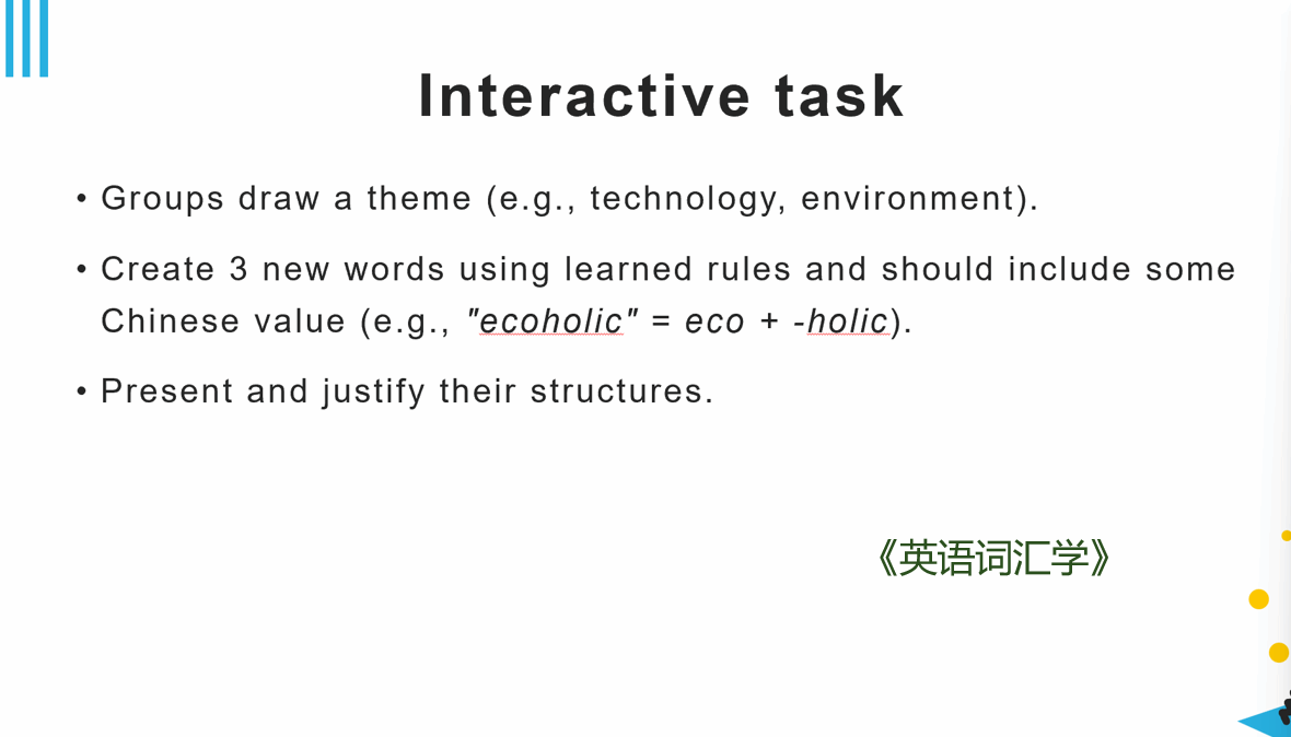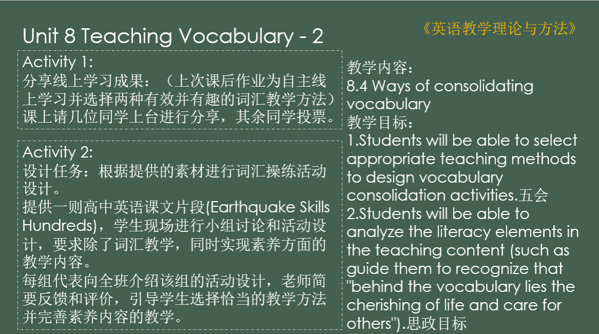 随后,李珮媛老师展示了《英语词汇学》的教学大纲、教学日历和教案。她介绍到,课程通过丰富的活动帮助学生完成知识点的记忆与理解,例如在讲解 “自由词素”“黏着词素” 时,通过分类和举例融入思政内容。邓慧琳老师听完分享后,对线下活动的丰富度和趣味性表示赞同,同时探讨了线上学习的设计方式,包括如何进一步实现思政目标以及保证学生线上学习的效率。宋怡晓老师也表示,从该课程中学习到了思政融合以及评价方法,还有复习和预习任务的布置方式。