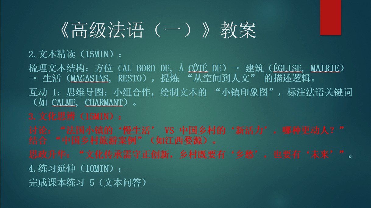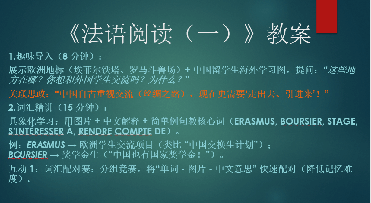 文静老师带来了两门课程的分享。在《高级法语(一)》的分享中,她介绍了课程的设计思路和教学方法。比如,在介绍法语语法的严谨性时,类比中国苏绣的精密或航天科技计算,让学生深刻理解 “严谨是专业的基石,语言学习需要精益求精”;通过学习课文了解法国乡村生活,引导学生比较法国乡村慢生活和中国新农村发展,在思辨学习的过程中,做出文化认同和跨文化交际的引导。刘潇老师肯定了该课程思政内容的丰富度和可行性,并探讨了情景模拟活动的操作方法。徐慧老师则提出并讨论了该课程 OBE 的达成情况和相应设计方式。之后,文静老师又展示了《法语阅读(一)》的课程设置和课堂活动,介绍了如何通过阅读文章引导学生思考文化传播,尝试用法语讲中国故事,还通过设计 “挑战卡” 活动进行思政激励,促进中法文化的比较学习。阳江玲老师和柳昱老师听后,梳理了可借鉴和学习的部分,包括如何有效导入和融入思政,还讨论了学生复习和巩固知识的方法,以及精读和泛读内容的安排。