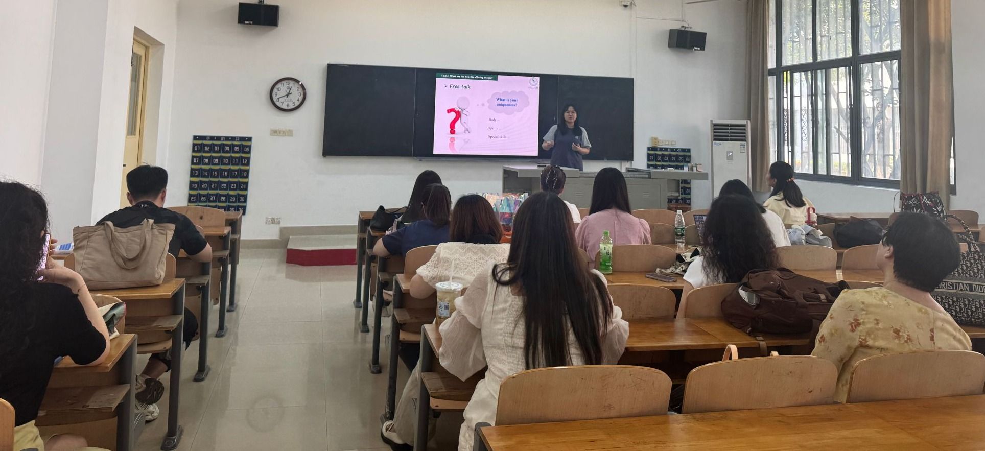 首先,新入职教师何嘉欣以《新时代大学英语Ⅰ》第二单元What are the benifits of being unique?为课题,进行了20分钟的说课展示。她通过“导入-主体-总结”的结构,引导学生思考独特性价值,并结合案例(如残疾音乐人Akes的励志故事)分析精神品质与特殊技能的意义。课堂设计注重逻辑层次,以主题句、细节阐述和结论句构建段落框架,并融入小组互评与作业反馈环节。何老师通过创设真实情境,激发学生写作兴趣,将教学设计与新课标理念融合,与会老师纷纷给予意见和建议。
