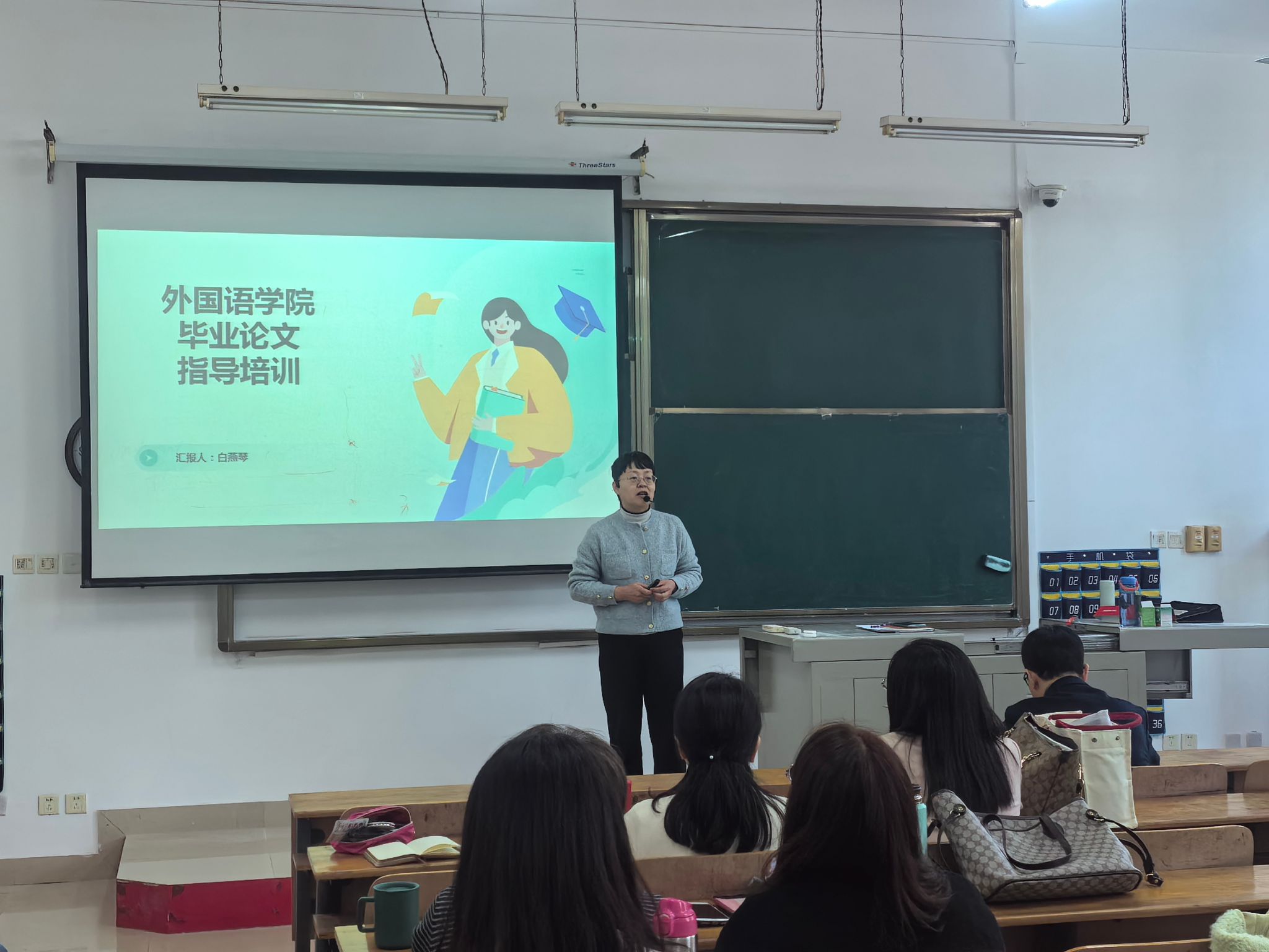 为进一步提升2026届毕业论文指导教师的专业能力,确保论文指导工作精准、高效,统一全流程规范标准,2025年10月24日12点40,外国语学院在1-104组织开展了2026届毕业论文指导教师专题培训,由白燕琴副院长担任主讲人。培训聚焦毕业论文指导核心环节,从课题性质界定、题目审核规范,到文本各模块指导要点,系统拆解任务书、开题报告、提纲、摘要等关键内容的指导要求,为教师提供清晰、可落地的指导框架,助力提升毕业论文整体质量。