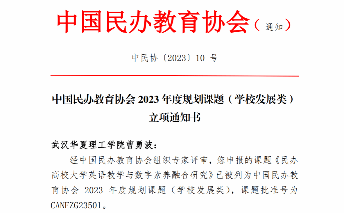 近日,中国民办教育协会发布2023年度规划课题(学校发展类)立项通知(中民协〔2023〕10号),其中,外国语学院副院长曹勇波副教授申报的课题《民办高校大学英语教学与数字素养融合研究》已被列为中国民办教育协会 2023 年度规划课题(学校发展类)。这是我院首次在中国民办教育协会获批规划课题(学校发展类),也是我院获得国家级协会研究课题的又一新突破