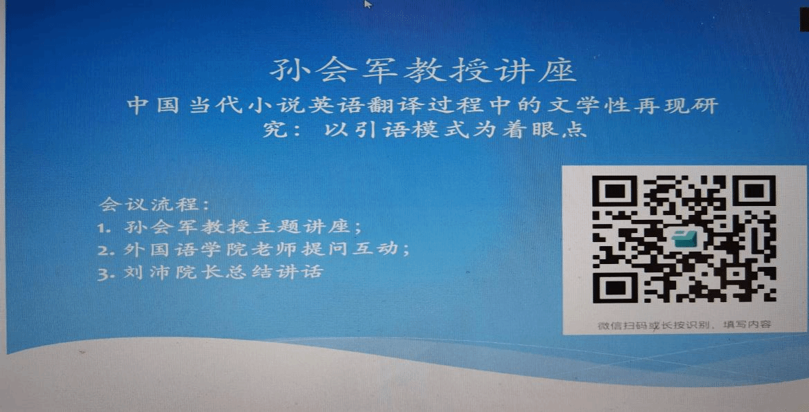 为了提升全院教师的教研水平,2024年12月6日,外国语学院举办了文学翻译研究专题线上讲座。邀请上海外国语大学孙会军教授以“中国当代小说英语翻译过程中的文学性再现研究:以引语模式为着眼点”为题专题授课,刘沛院长出席本次活动,外国语学院全体老师线上聆听了讲座。