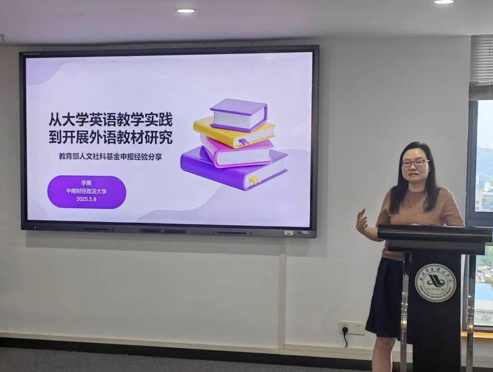 5月8日下午2点,我院在教发中心1401室举办了一场题为“从大学英语教学实践到开展外语教材研究-教育部人文社科规划基金申报经验分享”的专题讲座。本次讲座邀请了中南财经政法大学李展教授主讲,外语学院副院长曹勇波主持,全体教师参加。
