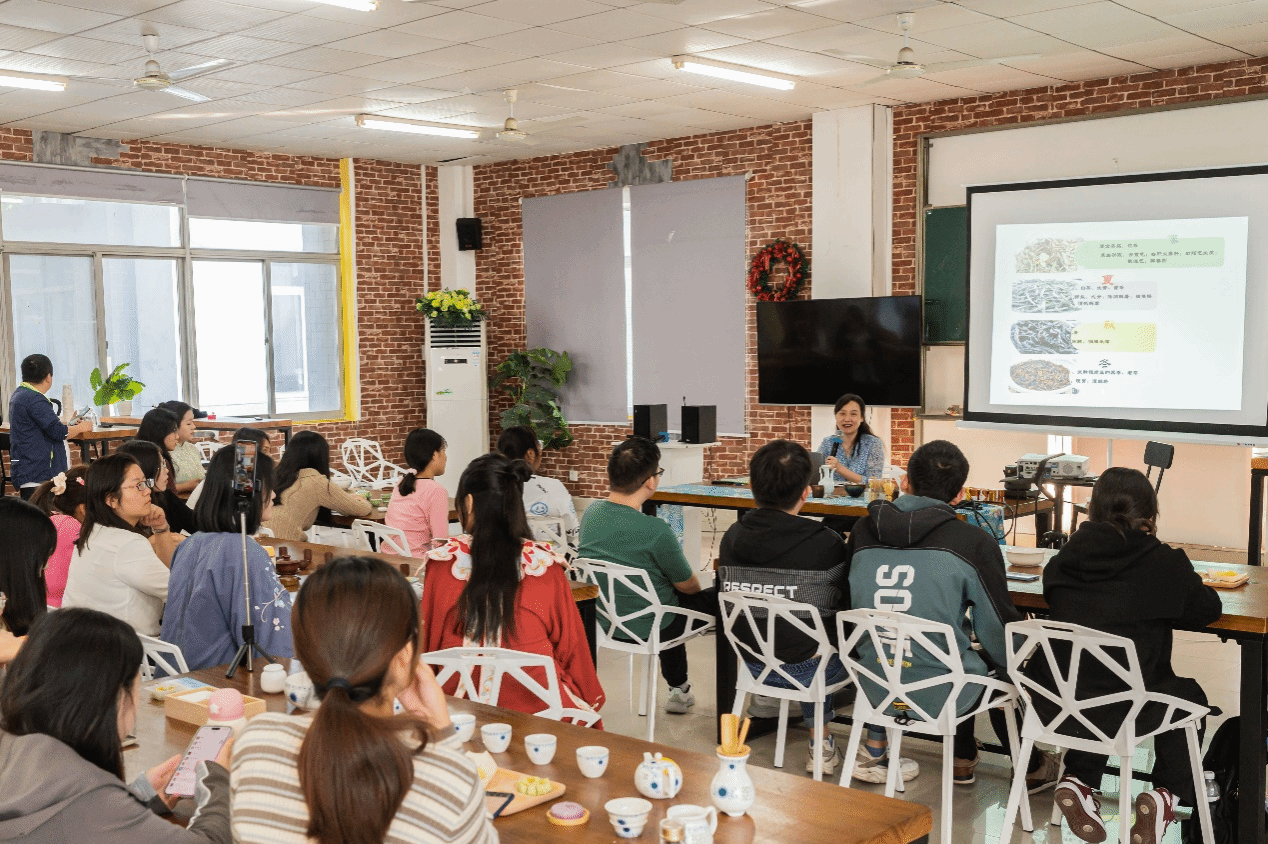 接下来的环节中,刘晓芬老师向学生们介绍了六大茶系种类,随后将茶叶倾倒在桌上,让学生们来猜测茶叶品种并进行分类,学生们兴致勃勃,积极参与互动环节,收获颇多。刘晓芬通过这样的小游戏,让学生们对茶的种类有了更深的认识。