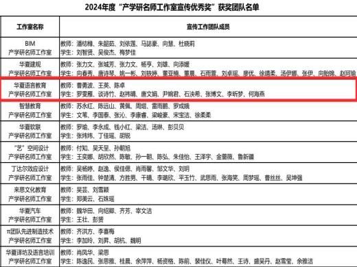 据悉,此次评选经各工作室申报、学院审核、科研部评审等严格流程,旨在表彰在产学研名师工作室宣传工作中表现突出的团队。华夏语言教育工作室由教师曹勇波、王英、陈卓领衔,罗雯雁、谈诗竹、赵祎晴、唐文娟、尹婉君、石泱希、张博文、李昕梦、何海燕学生共同组成的宣传团队,在过去一年里,围绕工作室的教学成果、科研动态、师生风采等方面开展了大量富有成效的宣传工作,全方位展现了工作室在语言教育领域的特色与优势,为提升工作室的影响力和知名度贡献了重要力量。
