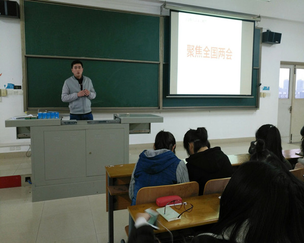 3月5日下午18时,正值两会开幕之际,外语学院为引导学生关心国家大事,利用晚点名时间开展了两会宣讲。