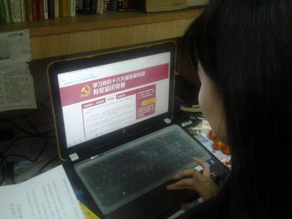 与时俱进,外语先行。外语系学生通过寝室或电子阅览室的电脑,参加了本次的知识竞赛。在答题过程中,同学们认真读题,根据自己的了解进行选择。当然,许多同学更是以此为契机,重新回顾了十八大的历程,反复阅读十八大,力求做新时代的大学生。一共是一百道题,在完成之后,同学们更是相互讨论,更加有了主人翁意识。
