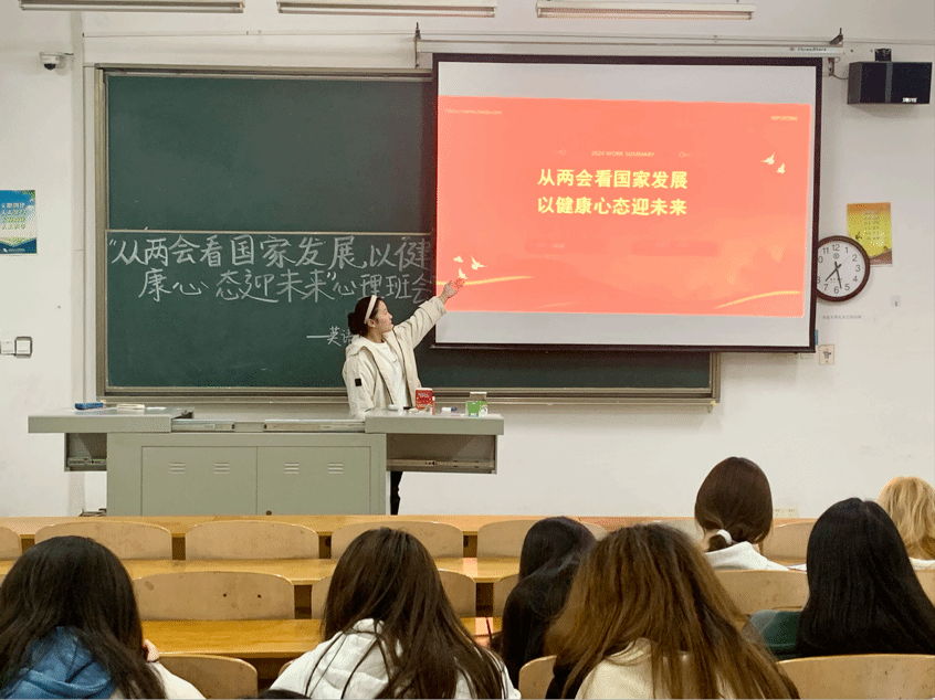 为了深入学习贯彻习近平总书记在全国两会期间的重要讲话精神,强化思想政治引领,引导团员和青年在不同制度比较中深刻感悟我国国家制度和国家治理体系的显著优势,促使团员青年更加坚定制度自信、理论自信和文化自信,拥有积极乐观向上的心态。英语1231班于2024年3月22日晚上19:00-19:30在教学楼2号楼205教室组织并顺利召开了“从两会看国家发展,以健康心态迎未来”心理班会。本次心理班会由英语1231班的心理委员陈晓晗主持,英语1231班全体成员参加。