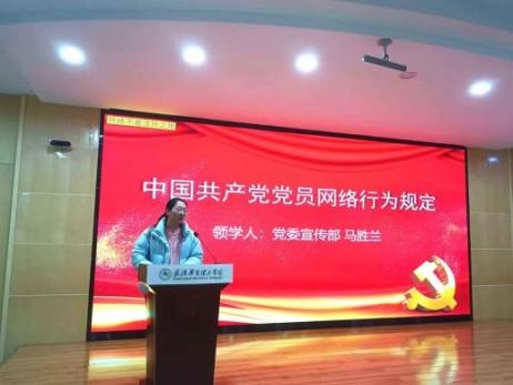 12月18日,为强化党员网络行为规范,提升党员网络素养与纪律意识,外国语学院党员服务站组织全体党员及入党积极分子开展了《中国共产党党员网络行为规定》专题学习活动,积极推动党内法规在网络空间的有效落实。活动在2-201教室举行,由党委宣传部党委理论学习与意识形态工作办公室主任马胜兰老师主讲,商英1231班的秦天同学担任主持。