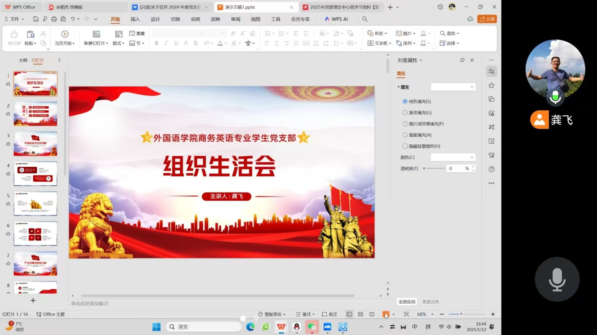 为深入学习贯彻党的二十大精神、二十届三中全会精神以及习近平总书记考察湖北重要讲话精神等核心内容,坚持不懈用习近平新时代中国特色社会主义思想凝心铸魂,商务英语专业学生党支部于2025年1月12日晚19:30成功召开了2024年度党支部组织生活会。此次会议通过腾讯会议平台以线上形式举行,旨在以深入学习和民主评议为契机,进一步巩固深化党纪学习教育成果,为确保党的重大决策部署在学校扎实落地、取得实效提供坚实的纪律保障。