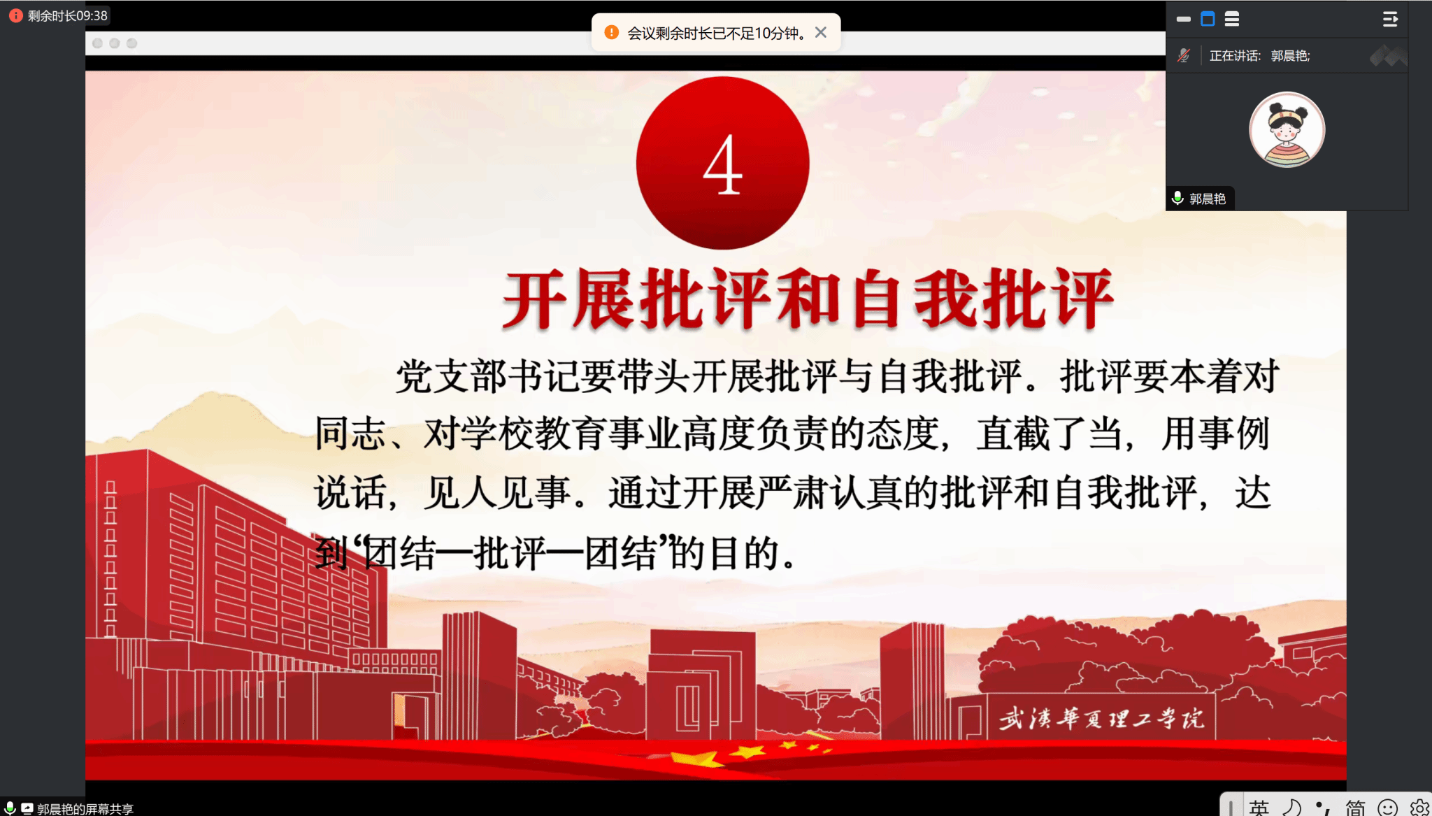 最后,支部书记郭晨艳对本次会议进行总结。她鼓励支部成员养成自我学习习惯,持续学习理论知识,期望全体成员能够以此会议为契机,将纪律要求和自身规划深植于心,并将其贯彻于日常学习与生活之中。她强调必须始终保持清醒的头脑,一旦发现问题,即刻付诸实际行动,不断克服困难,持续进步。