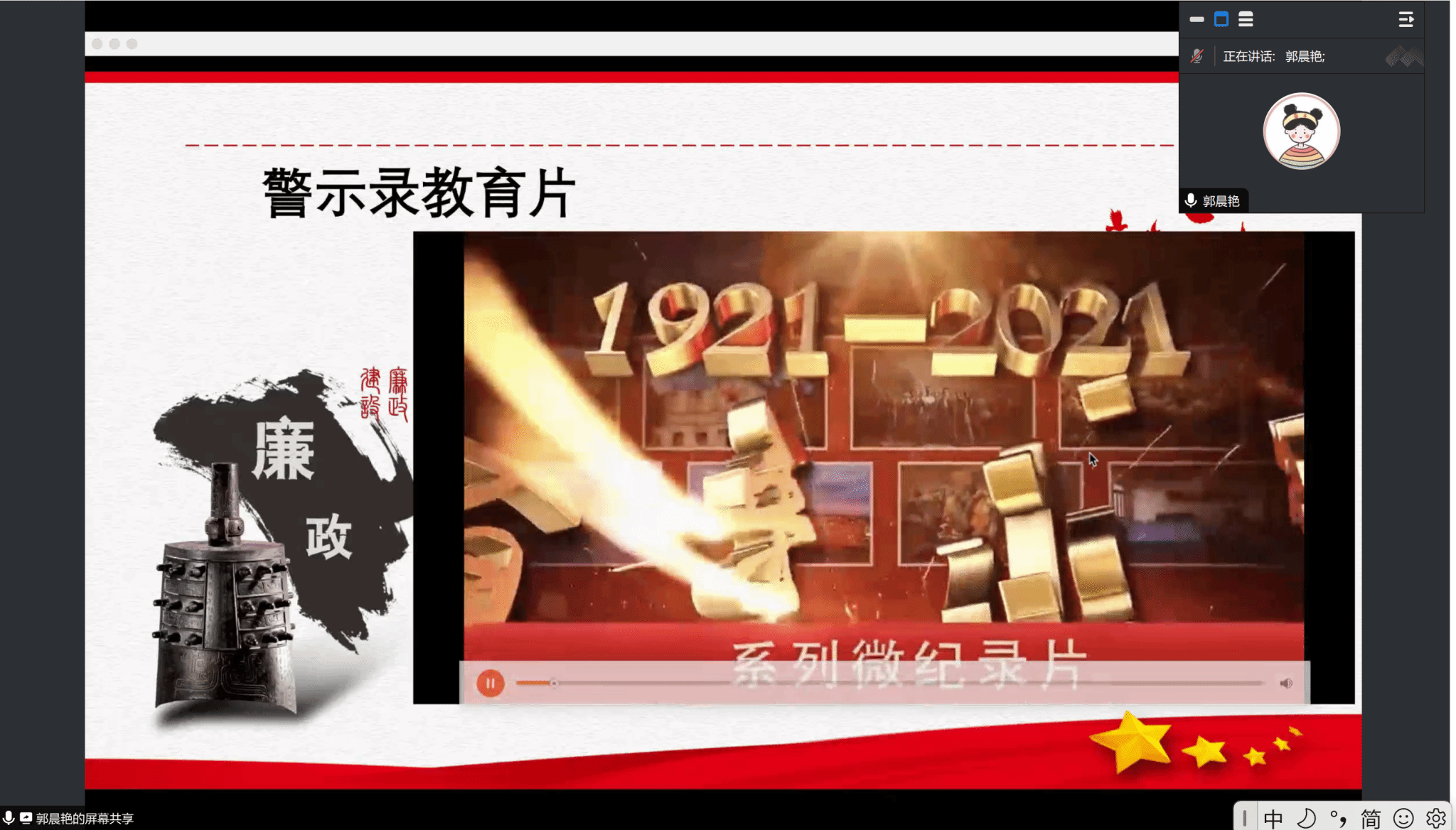 随后,为了深化大家对党纪重要性的认识,支部书记郭晨艳组织支部成员观看了廉政警示录教育片。通过一系列真实的案例,该片深刻展示了腐败行为对个人、家庭及社会造成的严重损害,令大家深受触动。对此,她鼓励大家进一步提升廉洁自律的自觉性,巩固拒腐防变的思想防线,坚守党的纪律底线,积极发挥党员的先锋模范作用。