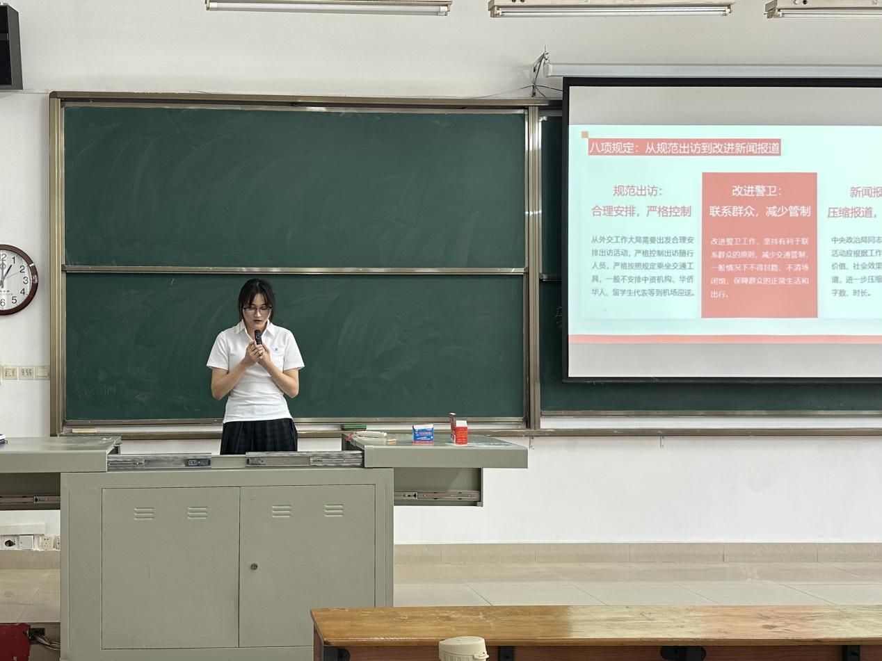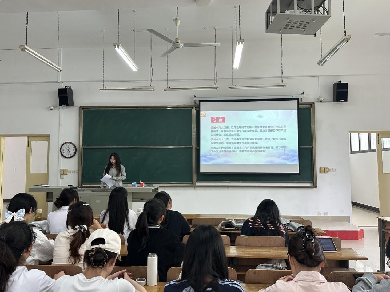 预备党员谈诗竹则聚焦基层实践,结合PPT内容解读八项规定在新时代的深化应用。她以“基层调研”为例,指出中央政治局同志深入群众、解剖典型的工作方法为青年党员树立了标杆;在“精简会议”方面,强调要杜绝“摆拍打卡”等形式主义作风,倡导高效务实;针对校园生活,她列举学术不端、活动形式化、特权思想等风险点,呼吁学生干部摒弃“官气”,以黄文秀、抗疫志愿者等榜样为镜,践行“光盘行动”“无纸化办公”等务实举措。