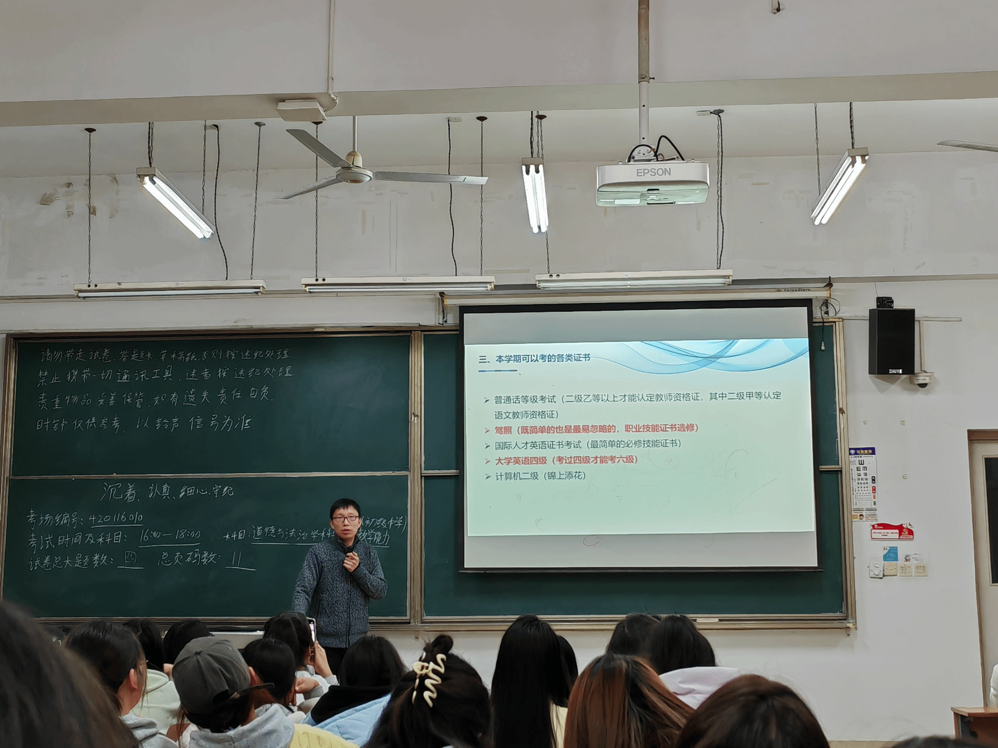 2023级辅导员杨森老师首先对第二周的考勤和内务进行盘点,23级早晚自习及课堂出勤总体正常,内务整体情况表现良好,对于迟到的同学提出了批评教育;其次,分析上学期期末考试情况,分别从2023级各分数段的总体情况,各班级各个分数段的分布情况,不及格课程的课程分布以及班级分布等多个维度对上学期的成绩进行了分析;再次,根据自身复习备考经历,对大学英语四级的复习备考和同学们进行了分享。