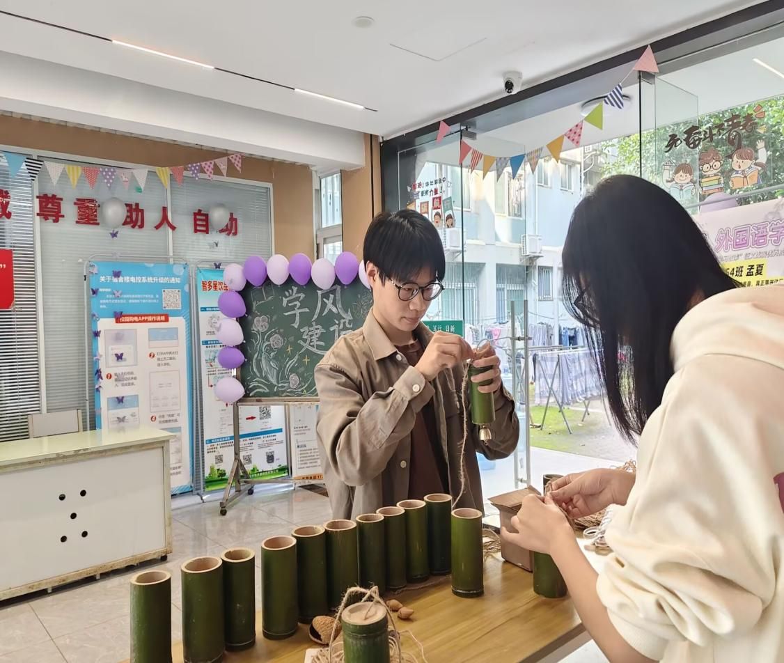 在制作过程中,参与的同学将天然材料的质朴与自身巧思创意,一同融入每一件风铃作品中。他们让手作的温度与学风的内涵相互交织,通过互相配合制作风铃,不仅拉近了彼此距离,更在协作中培养了团队意识。通过一番创作,同学们的作品都各具特色:有的带着环保自然的质感,有的用果壳挂件增添清新气息,还有的用铃铛增添趣味性。当面对镜头时,参与的同学自信地展示着精心制作的成果,表示出制作风铃的过程让他们成就感满满。