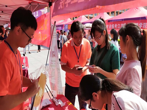 初夏时节,蕲春微风习习,天气宜人,全省高校汇集于此。上午8点,招生宣传工作开始。参与走片招生工作的机电学院汤剑老师已经在现场等候。三人迅速布置好现场,投入到紧张的招生宣传工作之中。