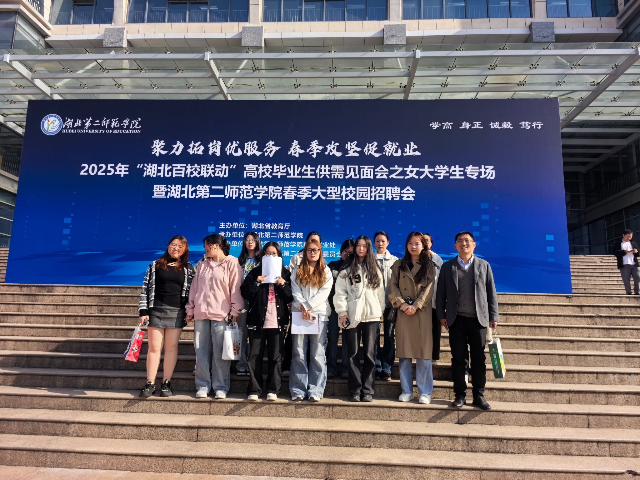 3月21日上午9时,外国语学院毕业班辅导员龚飞、张补峰两位老师,带领我院21级部分毕业生赴湖北第二师范学院,参加2025年“湖北百校联动”高校毕业生供需见面会女大学生专场暨春季大型校园招聘会。本次招聘会由湖北省教育厅主办,吸引了150余家优质企业参会,涵盖教育、外贸、跨境电商、文化传媒等多个领域,为外语类毕业生提供适配岗位逾百个。