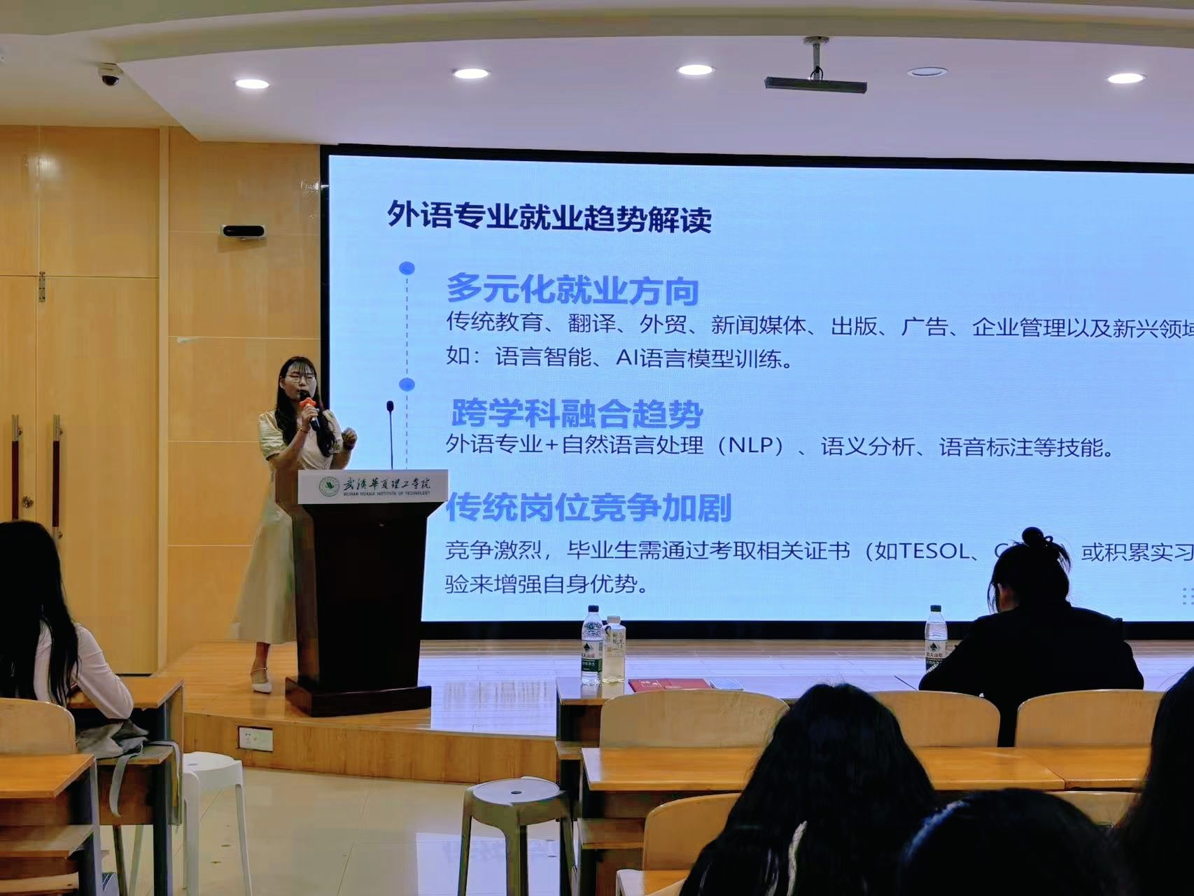 然后,她介绍了行业核心能力需求,强调外语专业学生需具备扎实的语言专业技能,包括听、说、读、写、译以及跨文化交际能力;要形成“外语 + 其他技能”的复合型竞争力;还应通过实习、项目实践积累经验,提升实践与创新能力。