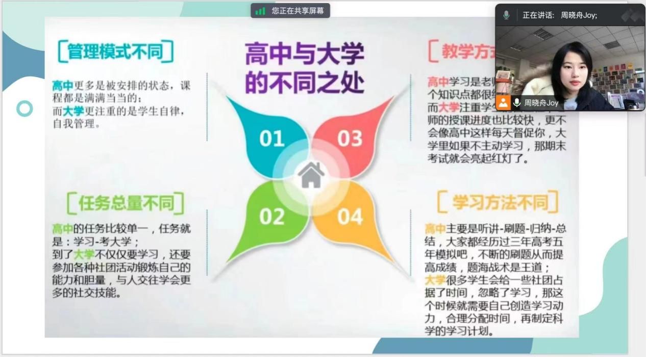 周晓舟同学在发言中首先分享了自己在日本的学习,留学生活以及目前的工作现状。其次,着重强调并主要从自觉规划学习时间、合理安排大学生活、未来学习和工作规划几个方面向同学们提出了自己的建议,让同学们对大学生活有了更深的理解。分享结束后,周同学还对同学们提出的大学学习计划、如何提高日语水平、日本留学等问题一一做出了解答。
