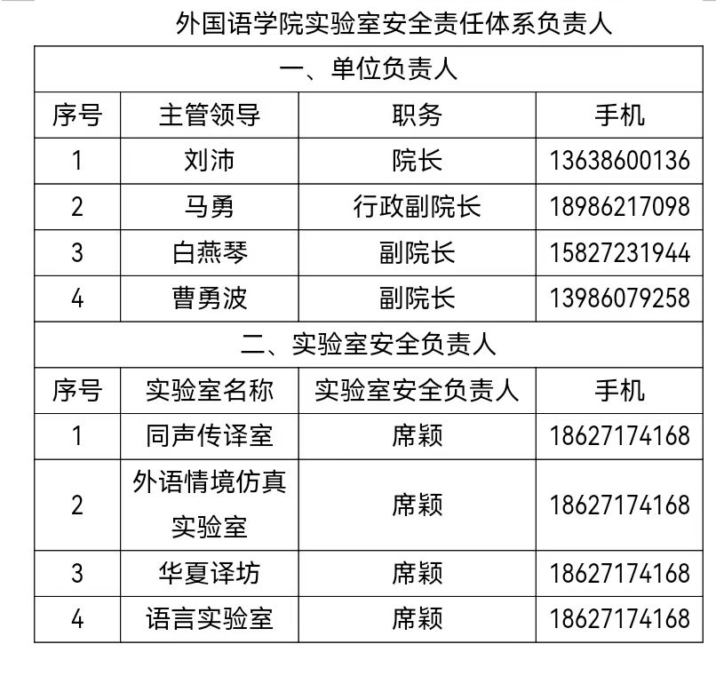 一、学院党政负责人是实验室安全工作第一责任人,全面负责实验室安全工作。其主要职责为:建立实验室安全责任体系;组织成立实验室安全领导小组;落实实验室安全分管领导和实验室安全负责人等人员;制定本单位的实验室安全工作计划并组织实施;落实实验室安全设施建设、改造与实验室安全管理的资金。