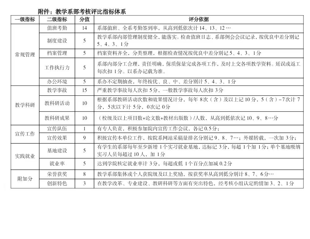 为调动教学系部工作的积极性和创造性,提高系部整体教育教学和科研水平,规范系部常规管理,营造积极向上的工作氛围,特制订本细则。