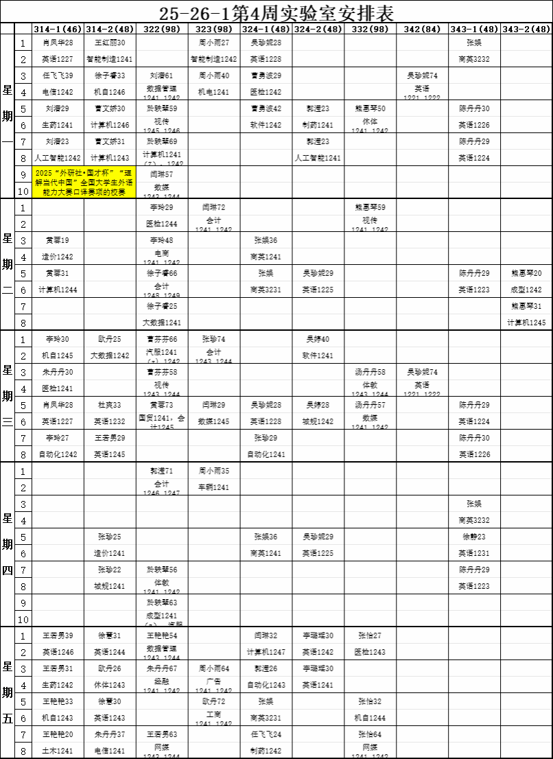 【实验教学】25-26-1第4周实验室安排表