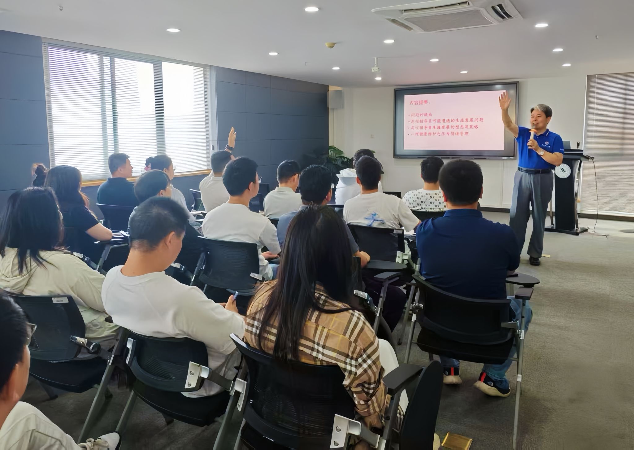 在压力情绪管理方面,雷教授现场模拟了辅导员在工作中可能遇到的各种压力场景,并引导大家用正确的方式去应对,现场气氛十分活跃。雷教授鼓励辅导员们在面对工作压力时,要学会积极应对,保持乐观的心态,通过合理的方式释放压力,以更加饱满的热情和精力投入到工作中。