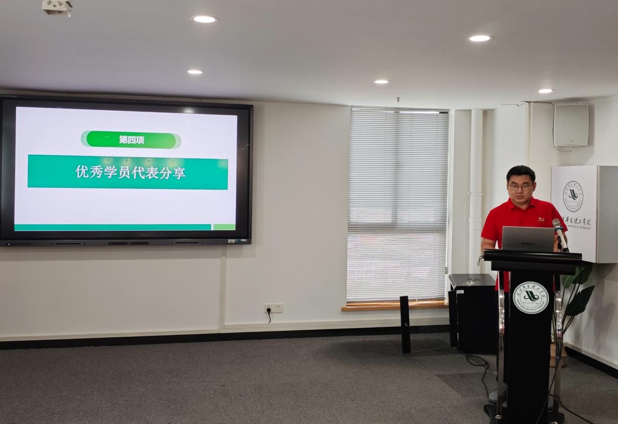 优秀学员代表陈张柱上台分享了他在培训期间的感悟与收获。他表示,在本次培训过程中,不仅学到了丰富的学生工作知识和技能,还结识了许多优秀的同行和前辈,从他们身上汲取了宝贵的经验和智慧。未来,他将以“学”为基、“行”为要、“爱”为魂,努力成为学生信任的知心朋友和人生导师。