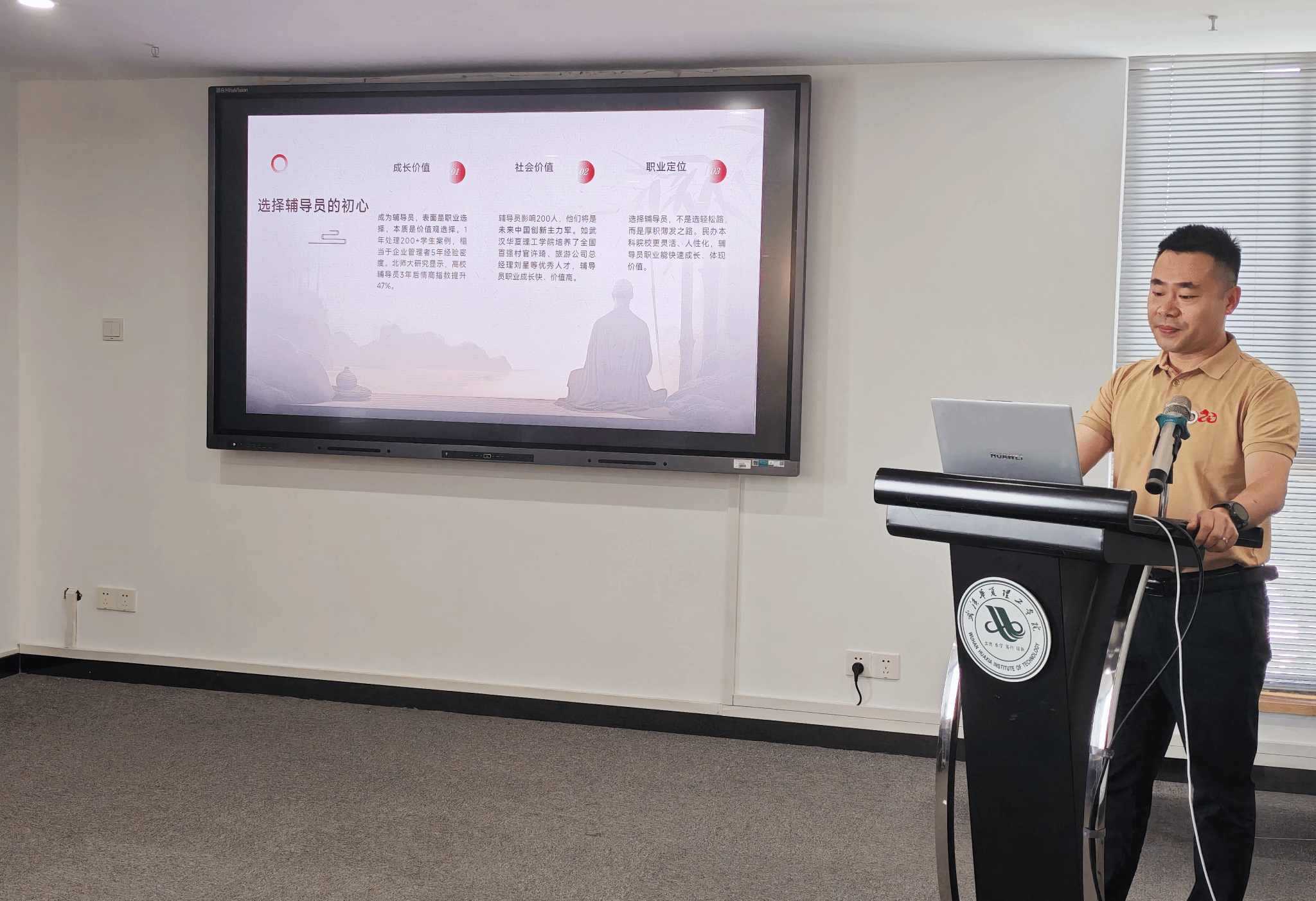 下午的培训聚焦工作创新与职业心态塑造。艺术设计与传媒学院张亮书记以“高校学生管理经验产品化与品牌塑造”为题,以问题为导向,从“为什么要培育品牌”、“怎样培育品牌”和“培育什么品牌”三个关键问题层层深入。通过“党建引领‘一站式’学生社区建设”和“‘育美·育心·育人’价值理念全力打造‘五位一体’学生社区心理育人机制”等极具代表性的品牌案例,详细解析“问题导向—特色凝练—持续迭代”的品牌培育路径,鼓励辅导员们在日常工作中挖掘亮点、打造特色,形成具有影响力的育人品牌。
