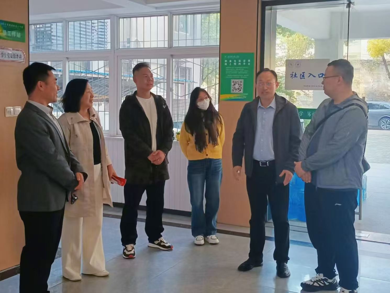 走进学生社区,其创新性的“学院 + 社区”育人模式给访问团留下了深刻印象。龚部长进一步说明,通过构建党建思政中心、学院心晴坊、教师工作站、生活保障部及就业解忧铺等多个功能阵地,实现了第一课堂外学生教育、管理与服务的无缝覆盖。这种模式不仅体现了学校对学生全面发展的高度重视,更在实际运用中巧妙且高效地利用了空间资源,让每一处空间都发挥出最大的育人价值。