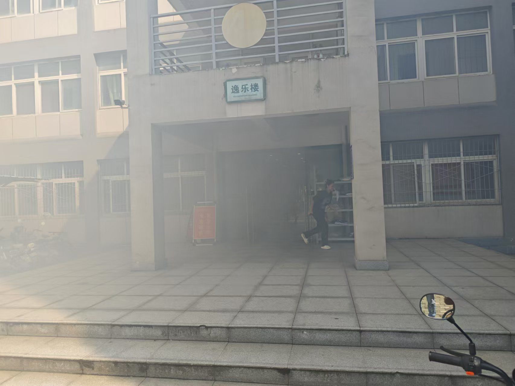 演练活动开始后,现场模拟火灾烟雾发生,公寓楼管理员发现“火情”迅速开启火警报警器。同时立即开启安全疏散门,关闭四号学生公寓楼电源,启动应急照明系统,向公寓管理科报告情况。消防警报响起后,参加演习的同学在管理员及疏导人员的引导下用湿毛巾捂住口鼻按指定疏散路线逃离“火场”。