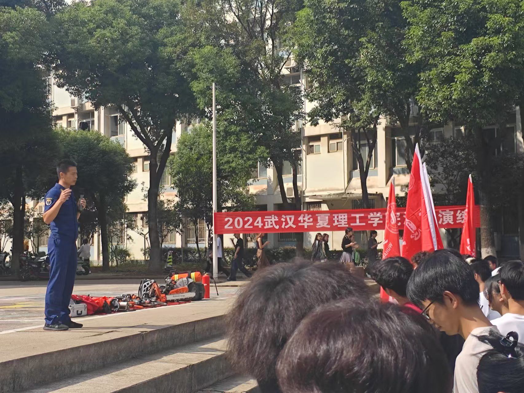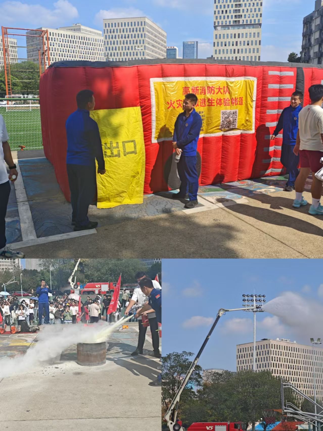 本次演练共分为“模拟火灾”应急疏散逃生、灭火器使用、常用消防救援器材展示3个部分。东湖高新消防中队的黄指导员为参演学生讲解了消防安全常识、违章用电器的使用危害、如何进行应急逃生、灭火器和常用消防救援器材的使用要点等内容。消防中队集中展示各类消防救援车并现场进行了消防车高空灭火展示。参加演练的2024级学生在消防员的指导下进行了干粉灭火器灭火实操演练、逃生帐篷体验等科目的演练。