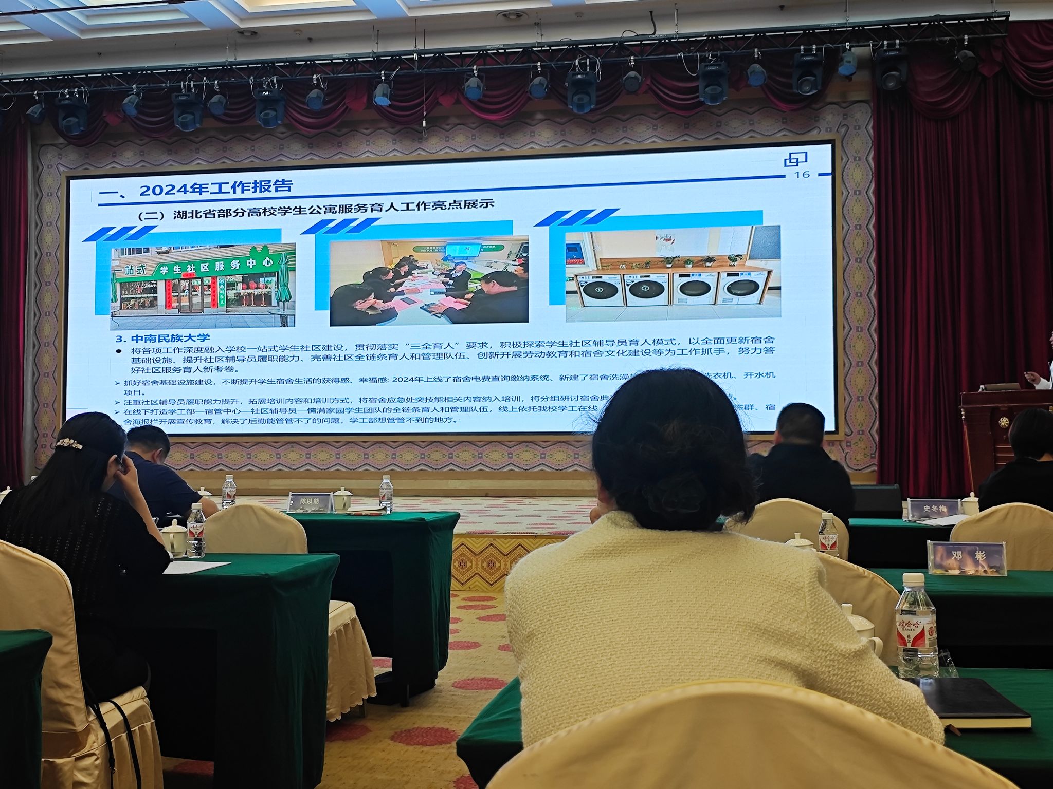 会议听取了宿专部2024年工作总结及2025年工作要点报告,明确了未来在标准化建设、智慧化管理、育人功能深化等方面的工作方向。华中农业大学、江汉大学、黄冈师范学院、武汉学院四所高校分别分享了特色管理经验:华中农业大学以“五色公寓”品牌建设为核心,融合智慧、文化、平安等多元内涵;江汉大学聚焦“标准化改造”,推动硬件升级与智能管理;黄冈师范学院通过“一站式”学生社区建设,实现管理服务与思政育人的深度融合;武汉学院则以“智慧化生活空间”为亮点,构建“四维一体”智能管理平台。