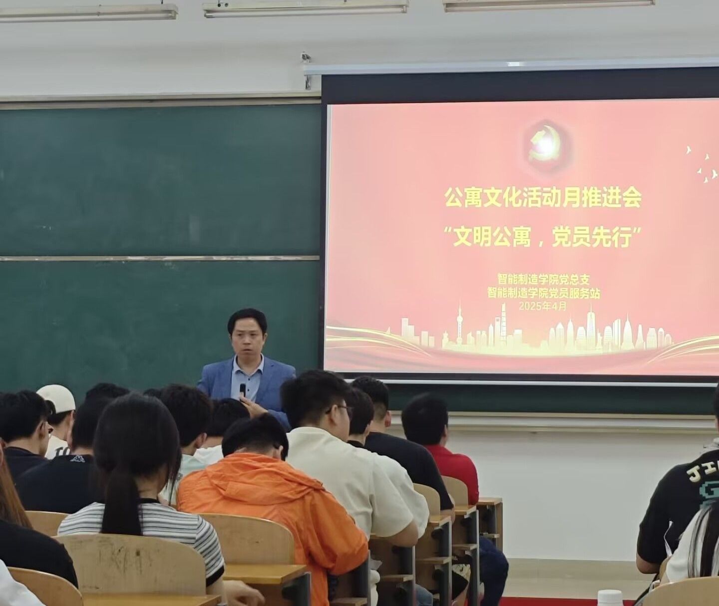为进一步推动学生公寓文化建设,发挥学生党员先锋模范作用,4月21日中午,智能制造学院在2-108教室召开“文明公寓,党员先行”公寓文化建设活动月推进会。学院党总支副书记靳路民、全体学工办老师、学生党员、发展对象、入党积极分子及宿舍长代表共同参与,会议旨在通过党建引领,深化文明宿舍创建,营造和谐、安全、文明的校园生活环境。