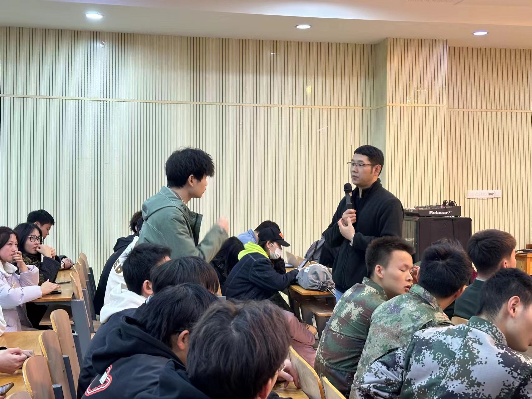 随后,从征兵政策法规、入伍条件、参军流程、大学生参军优惠政策等方面对2024的征兵入伍工作进行了详细讲解,并邀请退役士兵学生代表上台分享部队感悟,以朋辈学长学姐亲身经历为入伍意向学生上了一堂生动的动员课、宣讲课。与会同学也积极响应就自己关心的问题与主持人、退役士兵代表进行了热烈的咨询、问答。