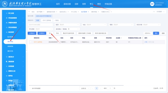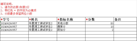 2.各学院在2024年9月25日前将“班级综合素质测评成绩统计表”(附件3)纸版加盖学生工作办公室公章后交学生事务中心刘佳老师,电子版导入到beat365官方网站智慧学工系统-学工-综合测评-测评审核-导入,详见图1,测评成绩录入示例详见图2。