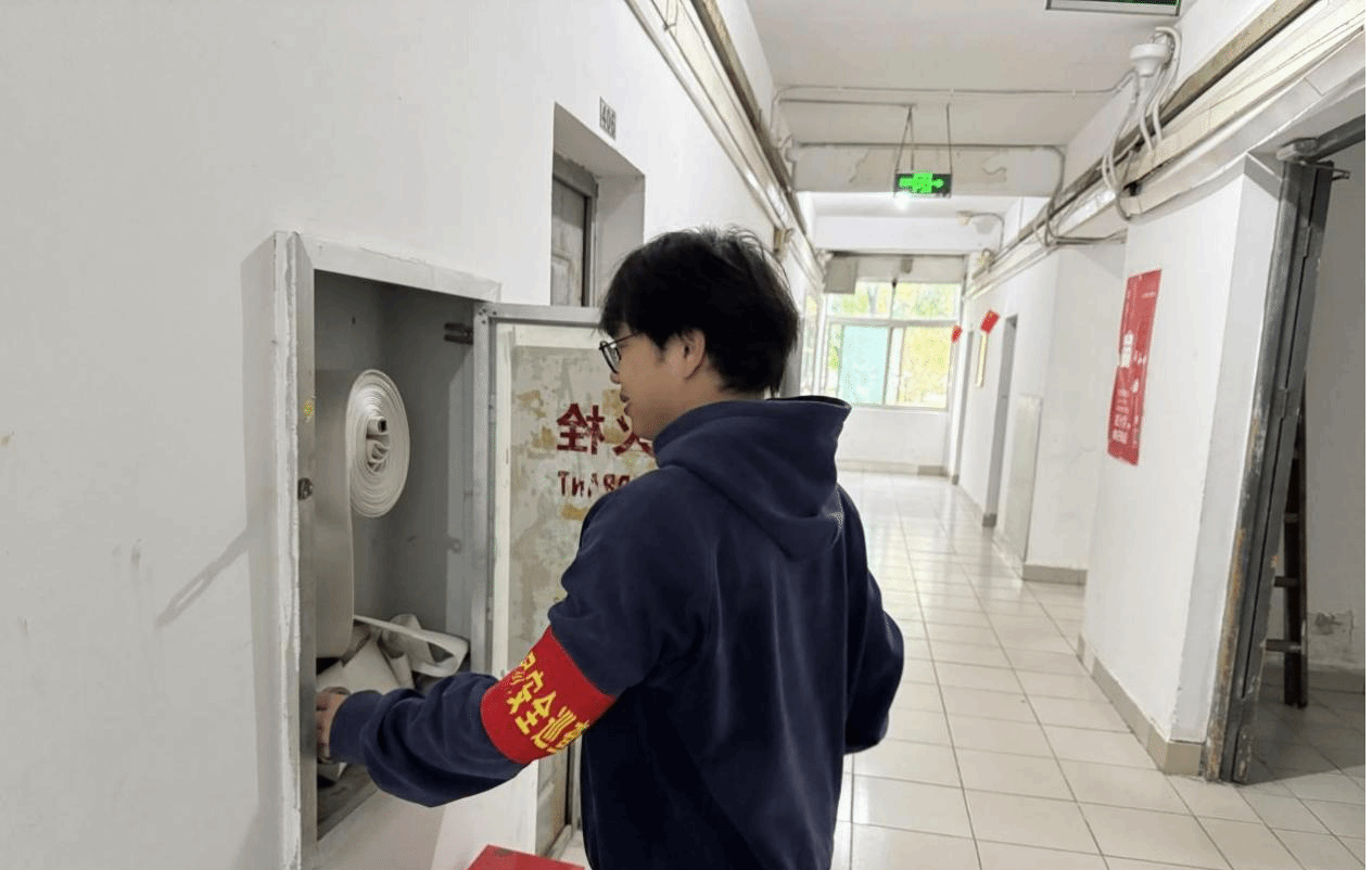 在七号楼四楼平台及周边走廊,同学们分工协作,对消防设施进行逐一检查。他们仔细核对每具灭火器的生产日期、消火栓箱内水带、水枪的完好性,不放过任何一处可能的安全隐患。