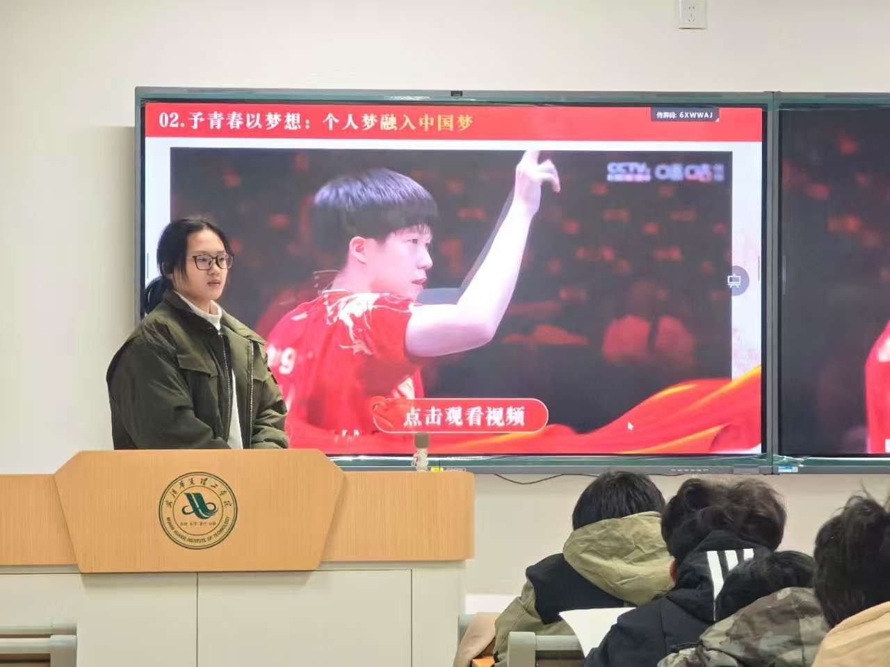 活动现场,团支书站在讲台前,结合精心准备的PPT课件展开分享。课件中既有“予青春以梦想:个人梦融入中国梦”的主题篇章,也展示了为国争光的体育健儿风采,以鲜活的榜样力量诠释青春与家国的紧密联结。从个人理想的树立到家国情怀的培育,从理论阐释到案例分享,主讲人层层递进,引导同学们深刻理解“青春逢盛世,奋斗正当时”的时代内涵。