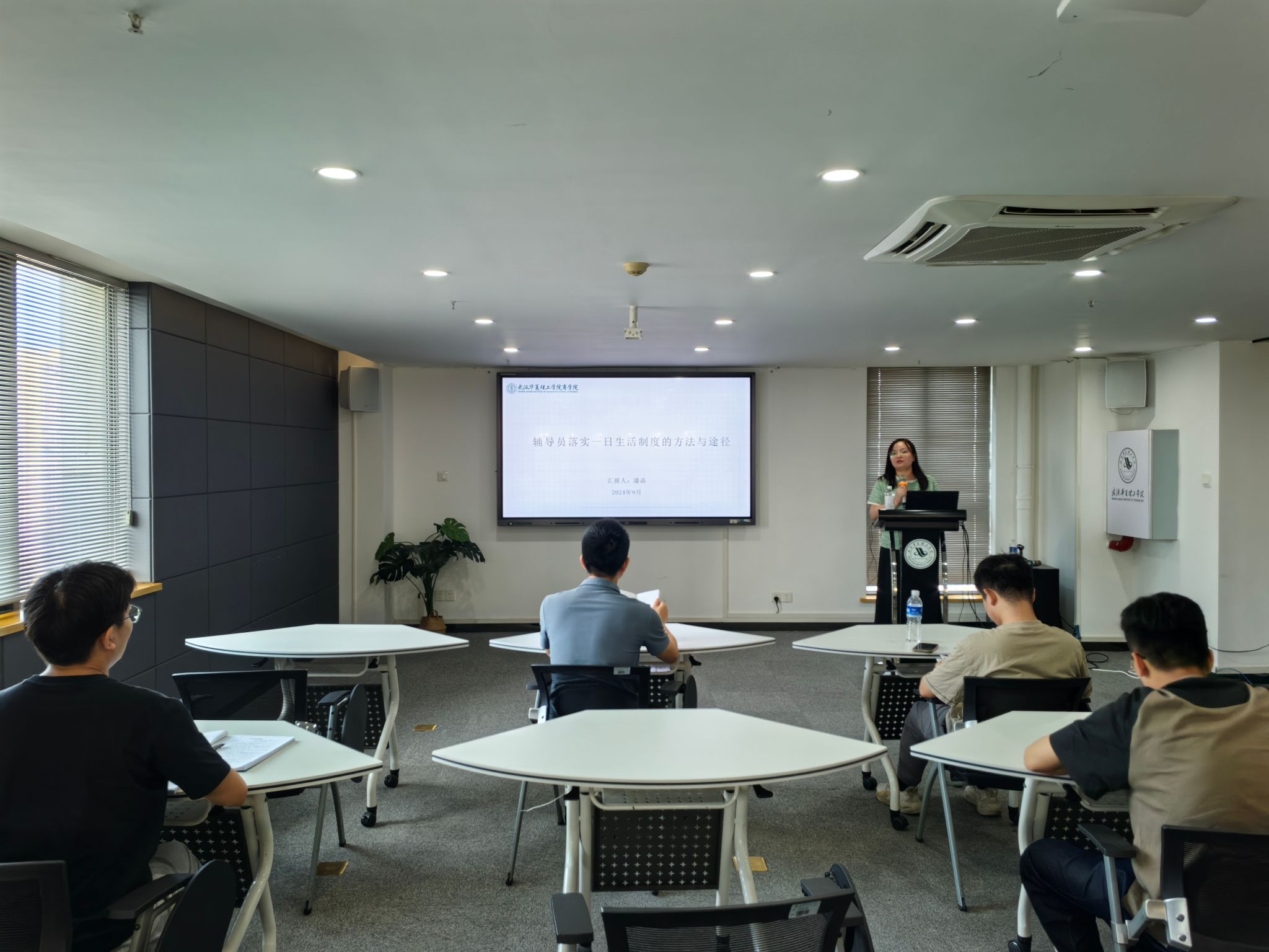 潘老师以“辅导员落实一日生活制度的方法与途径”为主线,结合《学生手册》相关条款,从公共值班、晚点评、主题班会、谈心谈话、随堂听课、联系教师、深入社区、学业分析、联系家长、工作例会、信息档案、联系就业等方面进行详细分析。她回顾自身工作经历,分享了作为辅导员与同学们相处的温暖、喜悦和幸福时刻。