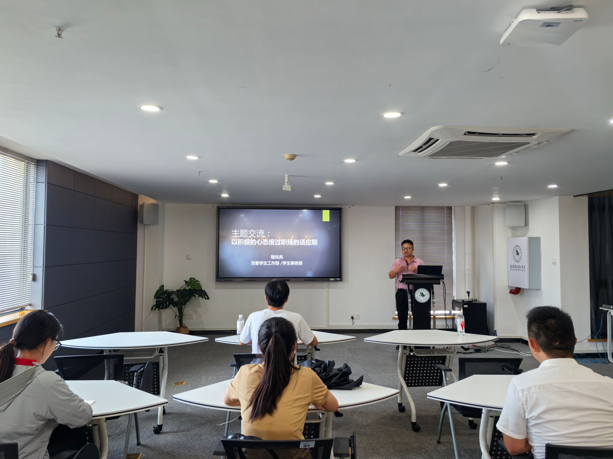 程先亮以“以积极的心态度过职场的适应期”为题,围绕“为什么来到这里”、“会面临哪些困惑”、“如何解决”三个方面展开,就辅导员待遇、安全感、归属感、幸福感等话题与大家进行了亲切的交流与经验分享。