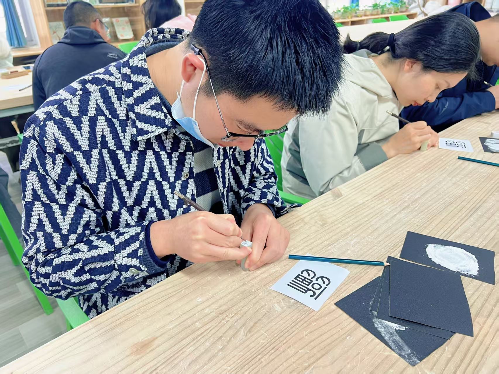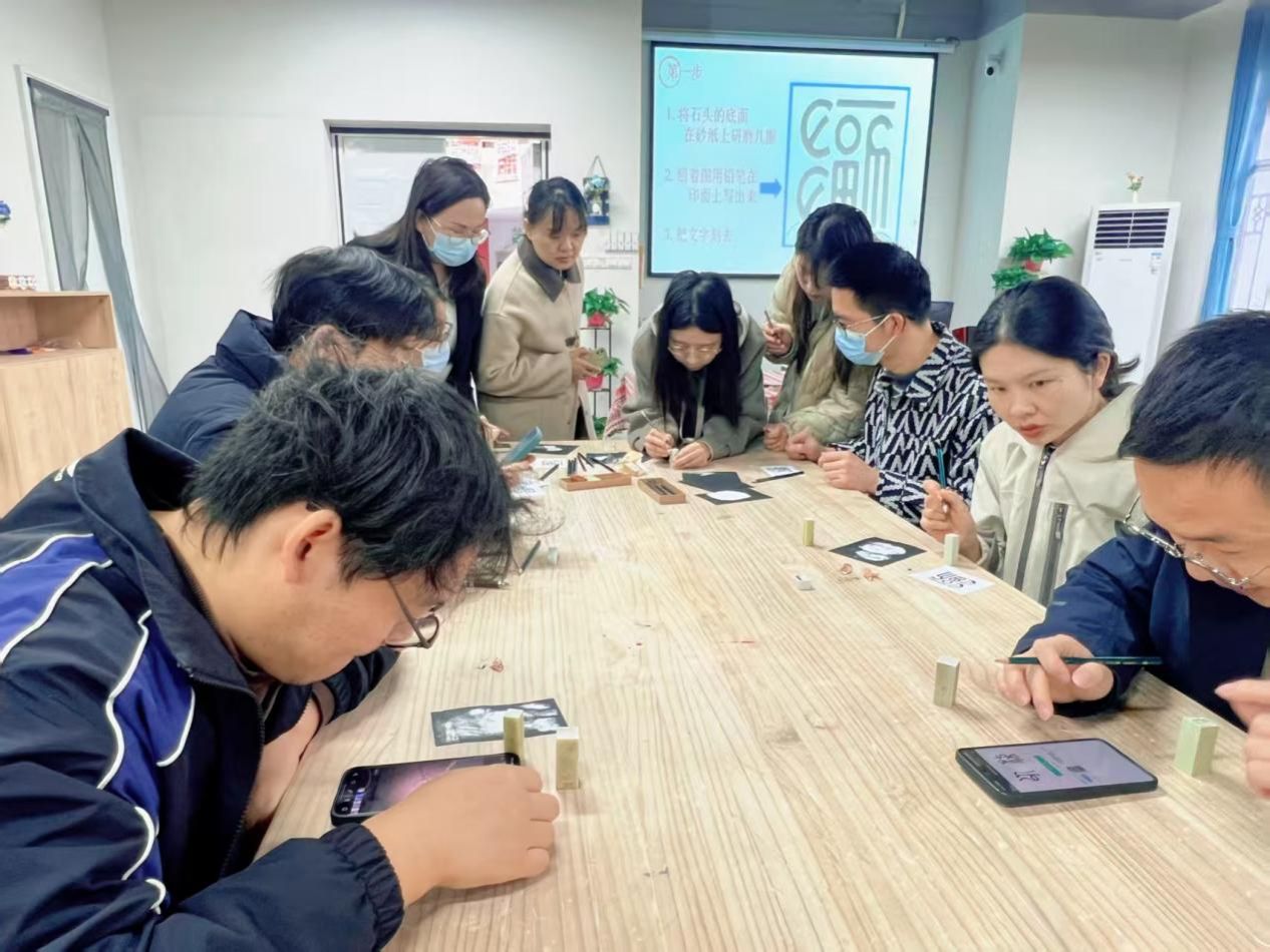 随后开展的手工实践环节将活动推向高潮。特邀嘉宾焦洁老师带领全体教师进行印章雕刻体验。在她的指导下,老师们以石为纸、以刀为笔,将职业感悟与艺术创意融入方寸之间。有的镌刻育人箴言,有的呈现地标、吉祥物等创意图案。一枚枚独具匠心的印章,既展现了教师队伍的审美素养,更凝聚着他们对育人工作的深刻理解。活动现场欢声笑语不断,平日忙碌的老师们在沉浸式创作中放松身心、增进交流,石屑纷飞间传递着高校工作者的教育情怀。