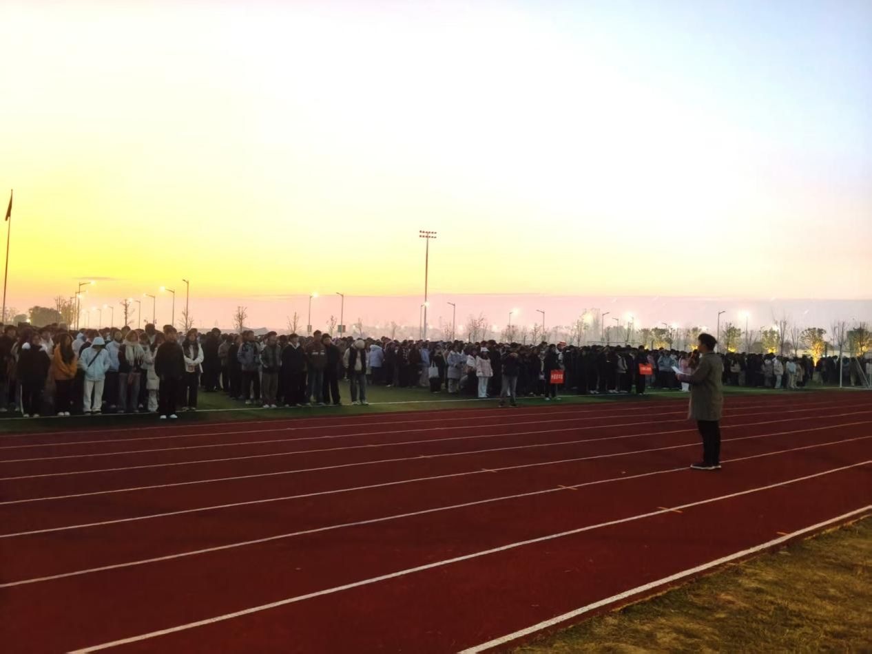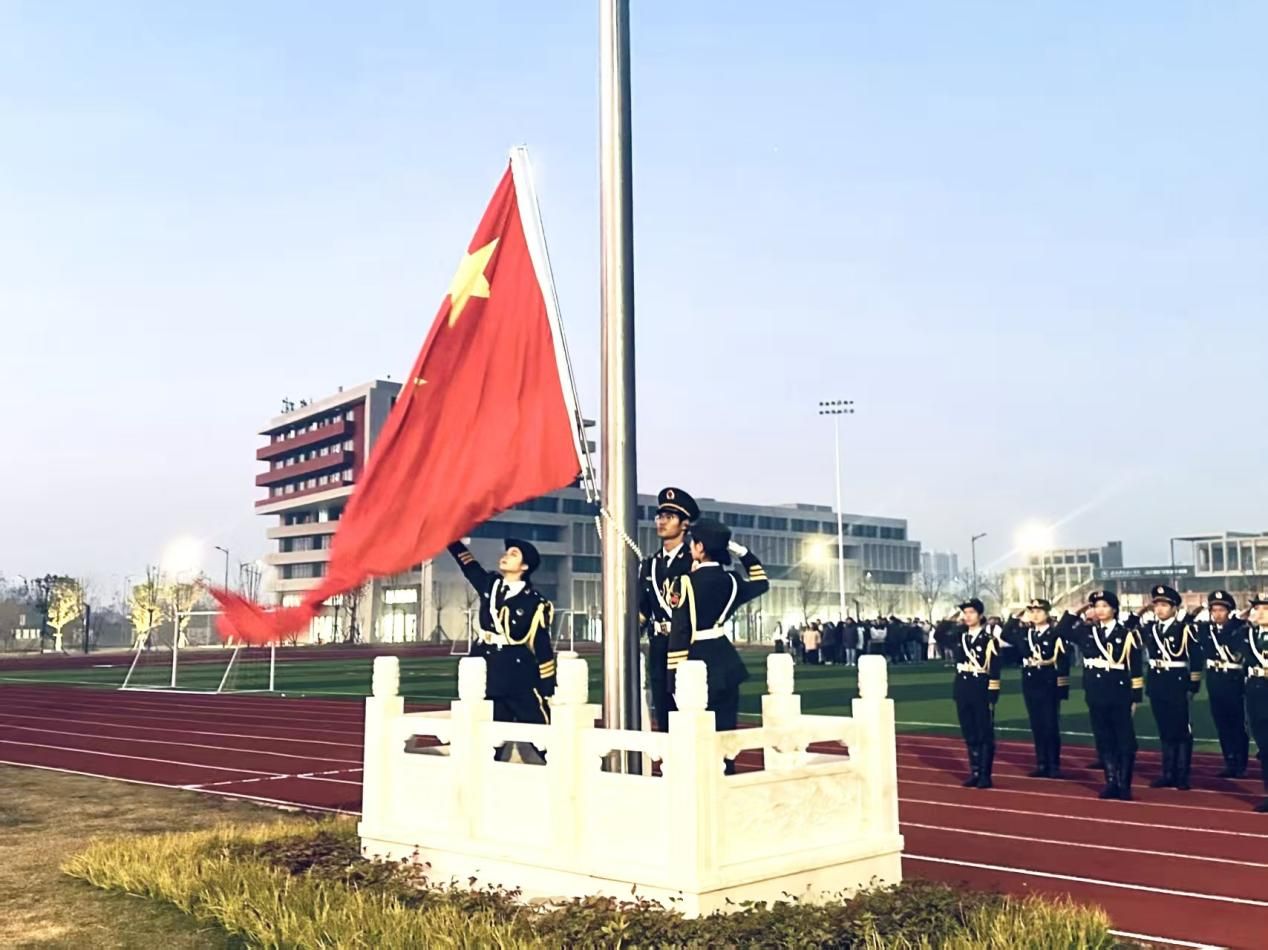 仪式伊始,伴随着雄壮的《义勇军进行曲》响起,五星红旗在朝阳中冉冉升起,全体师生肃立凝视,齐声高唱国歌,目光追随着那抹鲜红直至杆顶,运动场中满是庄重与崇敬的氛围。