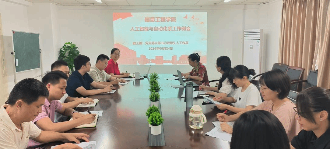 2024年6月24日中午12:20,人工智能与自动化系于综合楼702室召开系部工作例会。会议由系主任袁丽平主持,特邀信息学院责任教授张素文老师,系部老师全体出席。