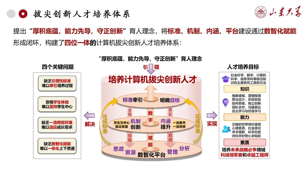为实现这一目标,山东大学计算机学院创新性地提出了“学、研、践、评”四位一体的培养标准,并将其贯穿于人才培养的全过程。同时,学院构建了高效的质量保障机制和教育教学水平提升机制,作为达成拔尖创新人才培养目标的双轮驱动。通过不断深化工程教育认证理念,优化质保机制,学院在“持续改进”中始终坚守“学生中心”,为拔尖创新人才的成长提供了肥沃的土壤。