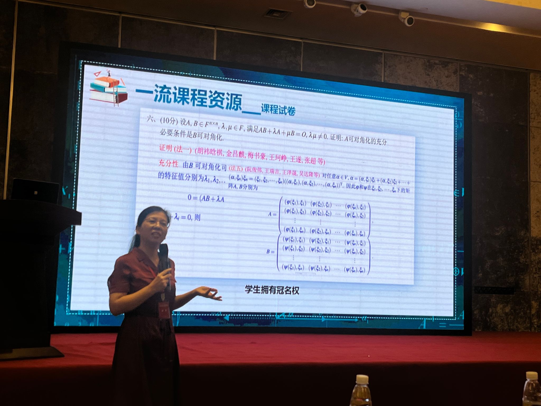 厦门大学杜妮教授分享的主题是《“高等代数”课程数字化教学创新与实践》,她认为数学课的难度摆在那里,教学创新要落实到学生的发展,教学创新点的选取可以从教学资源的设计、课程内容体系重构、线上线下教学的融合、教学评价的方法、现代教育技术的有效融入等方面着手。她提到厦门大学高等代数课程试卷(不含答案)资源共享,面向校内外所有学习者开放,学生可以上传不同方法的答案,且享有冠名权。她还选择AI助教辅助教学,把在课堂上不容易达成效果的内容拍成视频上传到在线课程中,学生自主按需求选择看或不看,课堂上则侧重重点和难点,学生也更容易对数学课感兴趣,更有学习积极性。