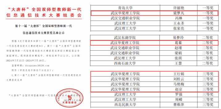 第十一届“大唐杯”全国双师型教师新一代信息通信技术大赛于2024年7月10日至14日在武汉理工大学举行,beat365信息工程学院教师团队在本次大赛中表现出色,斩获一等奖1项、二等奖1项、三等奖4项。