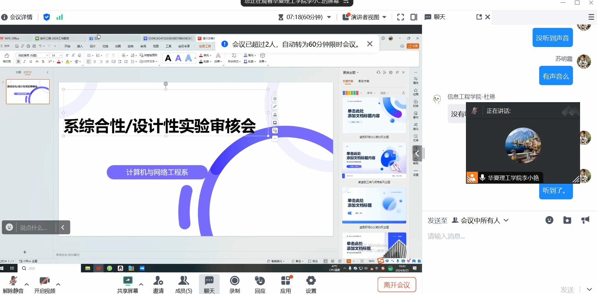 2024年8月25日,由校外专家陈利老师,计算机系负责人李小艳,苏明霞,杜琳,实验室教师刘琳琳,石婷组成的综合型/设计型实验审核小组以线上会议的方式对系部的综合型/设计型实验进行审核。此次会议的核心目标是确立计算机科学与技术专业,软件工程专业实验教学的高标准,以确保这些课程能够满足教育部门的严格要求,并有效促进学生实践技能与创新思维的发展。