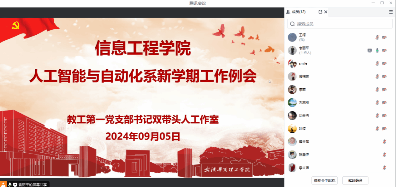 2024年9月5日,人工智能与自动化系在线上召开了新学期的系部工作例会,本次会议由系主任袁丽平主持,系部全体教师参加。会议主要围绕开学工作的各项安排展开,会议具体内容主要包括系部教师获奖情况和九月份的工作要点。