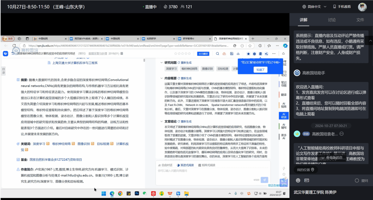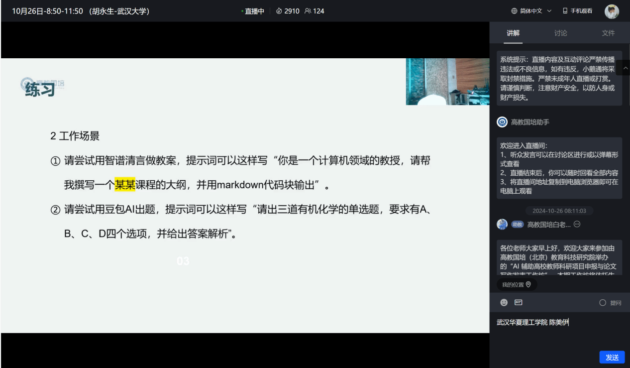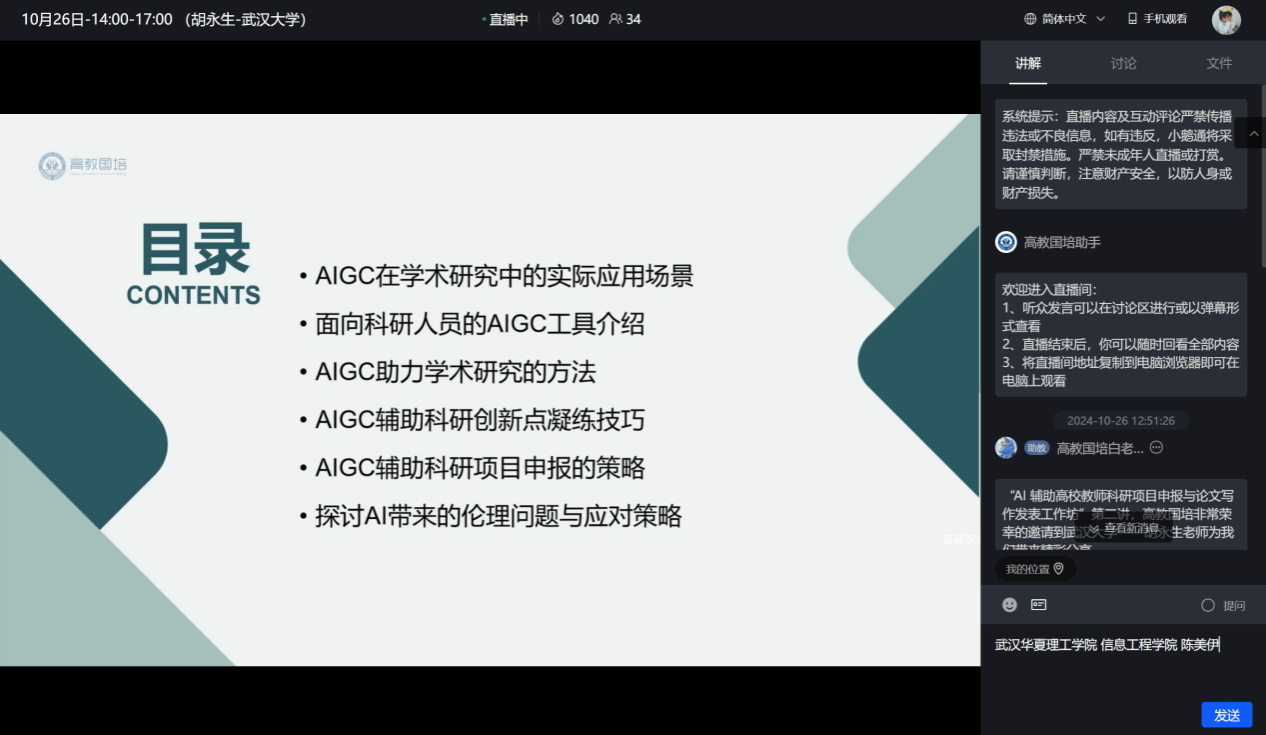 2024年10月26日至27日,信息工程学院人工智能与自动化系青年教师陈美伊利用周末参加了由高教国培组织的“AI辅助高校教师科研项目申报与论文写作发表工作坊”培训。本次培训邀请了来自武汉大学的胡永生主任和山东大学的王峰教授,分别从AI入门指南、借助AIGC提升科研效率、AI在科研项目申报书撰写中的应用与实践案例、AI工具赋能科研论文写作的全流程设计四个主题进行分享,旨在帮助高校教师更好地利用人工智能技术提升教科研效率与质量。