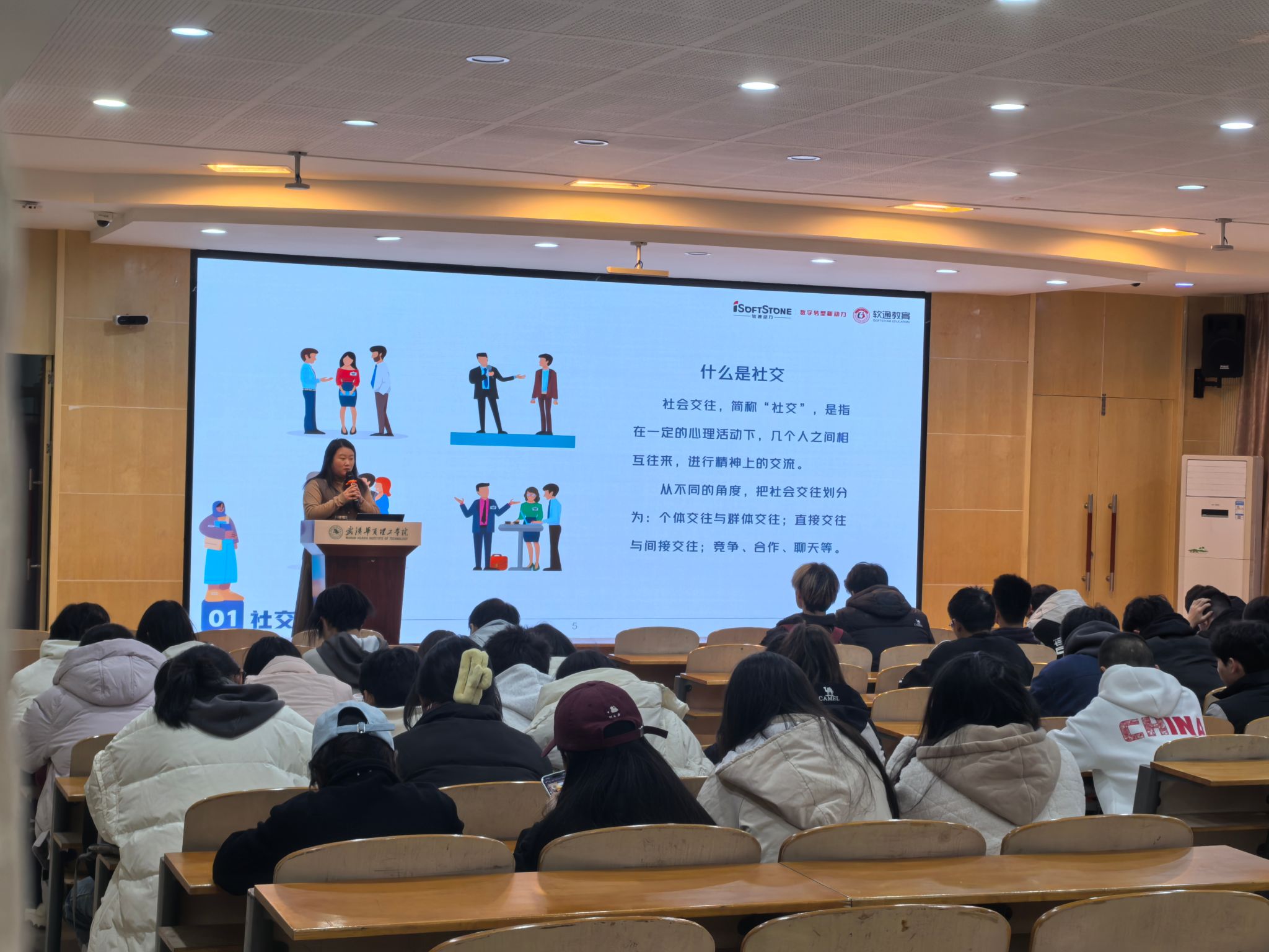 公开课上,讲师围绕社交的核心要点展开深入讲解。从对社交含义的精准剖析,通过生动的实例阐述个体交往与群体交往、直接交往与间接交往以及竞争、合作、聊天等不同交往形式的特点与区别,让学生们对社交有了更为清晰的认知框架。